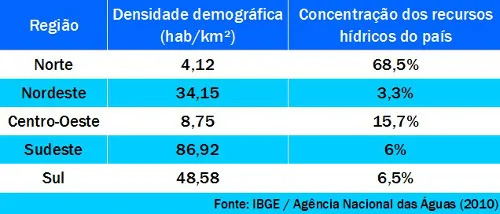 Uma das grandes questões referentes à problemática da água no Brasil está na localização geográfica da disponibilidade desse elemento. A distribuição da água no Brasil é naturalmente desigual, de modo que justamente as áreas menos povoadas do país é que concentram a maior parte dos recursos hídricos. Confira, na tabela a seguir, a relação entre densidade demográfica e a disponibilidade de água entre as diversas regiões do país.